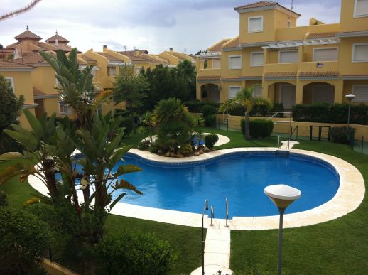 Magnífico adosado en la cornisa del campo de golf. Tiene dos dormitorios, baño y aseo, salón comedor, cocina, dos terrazas y plaza de garaje en sótano . El residencial se compone de jardines y piscina. Está muy cerca de la playa.